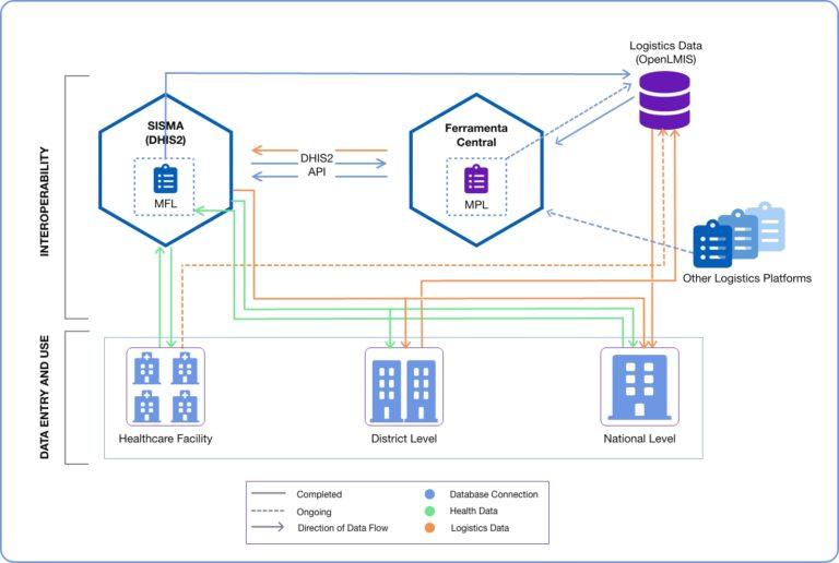 Em resposta a estes desafios, o Ministério da Saúde de Moçambique (MISAU) fez parceria com organizações como o Fundo Global, USAID, GAVI e Saudigitus (HISP Moçambique) para implementar soluções electrónicas inovadoras para a gestão da cadeia de abastecimento através da integração do DHIS2 com outras fontes de dados e ferramentas. Estes incluem o OpenLMIS, que foi implementado para gestão de estoque específico de vacinas como parte do Programa Alargado de Vacinação (PAV), o Lista das Principais Unidades Sanitárias (Master Facility List – MFL) que faz parte do Sistema de Gestão de Informação de Saúde, SISMA, baseado em DHIS2 e a Lista dos Principais Produtos (Master Product List – MPL) construído em uma plataforma personalizada chamada Ferramenta Central (FC). Os sistemas de logística de saúde interconectados resultantes são adaptados ao ambiente local para facilitar a gestão eficaz da logística de saúde, fornecendo dados confiáveis de gestão de estoque de medicamentos, vacinas e outros produtos médicos, bem como analisando dados de saúde e logística para melhores relatórios e planeamento. Para isso, a Saudigitus aproveitou as capacidades de interoperabilidade do DHIS2, bem como sua experiência no desenvolvimento da camada de interoperabilidade SISMA, para expandir a plataforma Sistema de Gestão de Informação de Saúde nacional, integrando os dados logísticos do MISAU e os da FC.